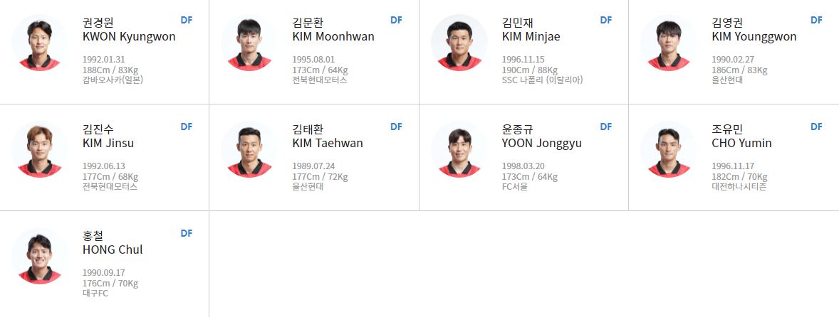 최근 나폴리에서 맹활약 중인 김민재 선수가 있는 DF 수비진입니다. 벤투 감독은 그 동안 대부분의 경기에서 포백 전술을 사용하였고 수비진을 크게 바꾸지 않고 지속적으로 기용하였기 때문에 수비 조직력이 좋을 것으로 예상됩니다. 김민재 선수 외에도 김영권, 김진수 선수가 주로 출전해왔으나 김진수 선수가 최근 부상이 있어 월드컵 출전 여부는 아직 불확실한 상황입니다.