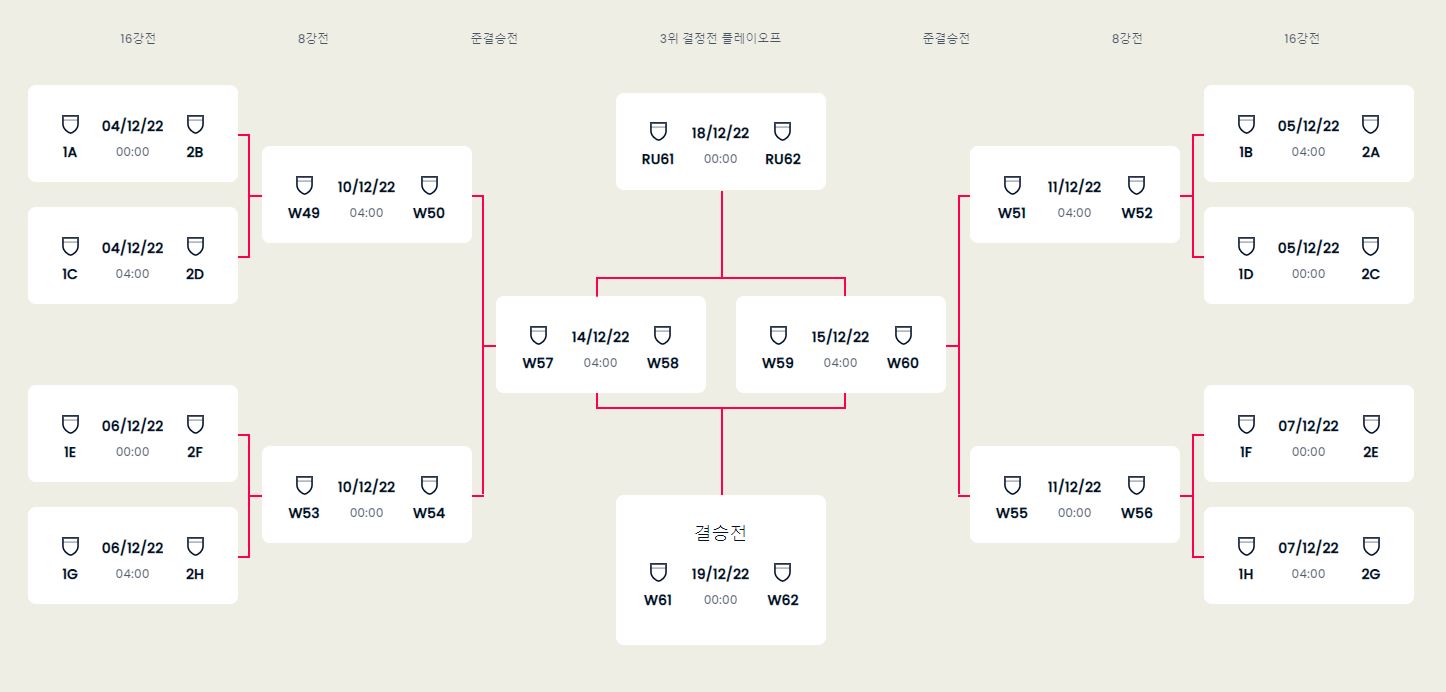 12월 3일 모든 조별리그 경기가 마무리 되면 바로 다음날인 12월 4일부터 본격적인 16강 토너먼트가 진행됩니다. 각 토너먼트에 배정될 조별 승자와 경기 날짜는 위에 그림으로 정리되어있습니다.