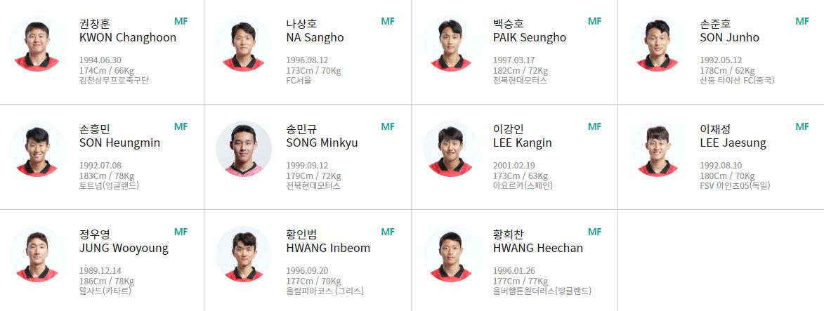 대한민국 축구 국가대표팀의 자랑인 손흥민 선수가 포함된 미드필더진입니다. 최근 손흥민 선수 부상으로 월드컵 출전 여부가 불확실한 상황이지만, 손흥민 선수의 강력한 의지와 마스크를 쓰고 훈련하는 모습을 볼 때 출전이 유력할 것으로 예상됩니다.