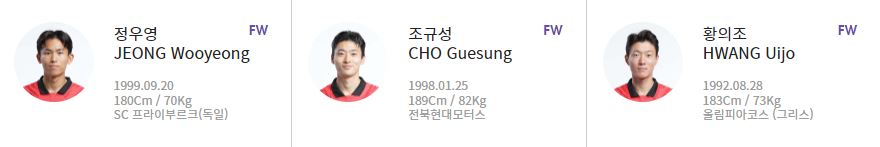 대한민국의 공격을 책임질 FW 공격수 3인방입니다. 그동안 벤투 감독의 선수 기용을 볼 때 황의조 선수가 주로 기용될 가능성이 높아보이나 최근 황의조 선수 폼이 떨어지고 있어 다른 선수가 기용될 수도 있을 것으로 예상됩니다.
