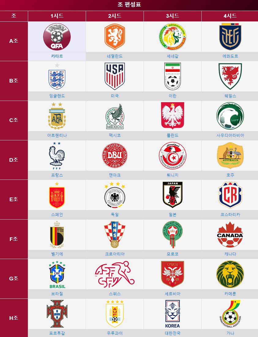 2022 카타르 월드컵 조편성은 위와 같이 8개의 그룹으로 완료되었습니다.